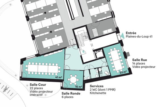 Trois salles de réunion pour 6, 16 et 22 personnes, disponibles pour des personnes extérieures hors des horaires de bureau.